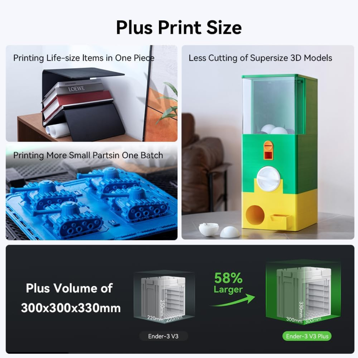 The Ender-3 V3 Plus takes the incredible 600mm/s speed of the new CoreXZ system and expands it to a massive 300x300x330mm build volume. It’s built from the ground up for large-scale, high-speed production.