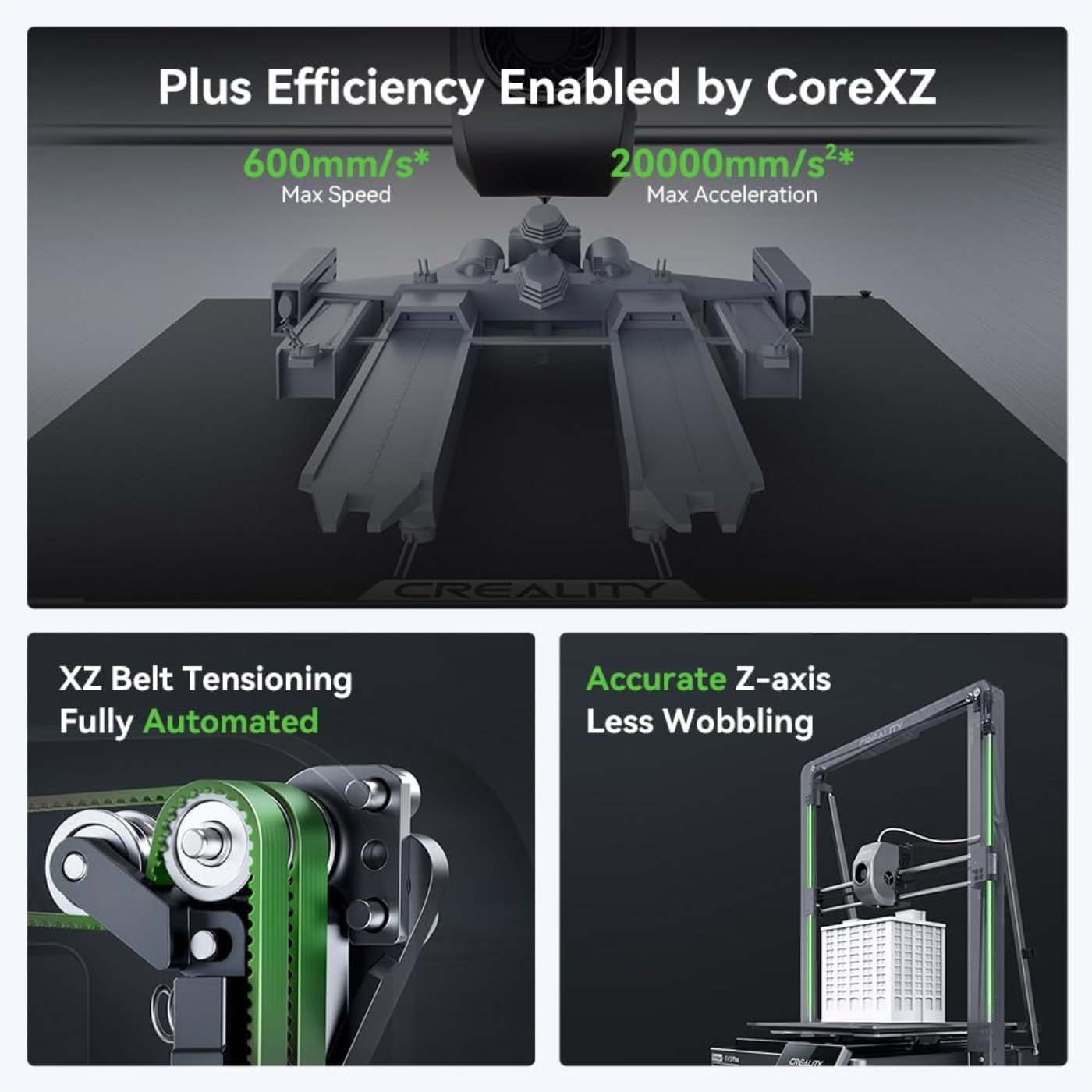 Go big and fast with a massive 300x300x330mm build volume, 600mm/s CoreXZ speed, and an ultra-stable frame.