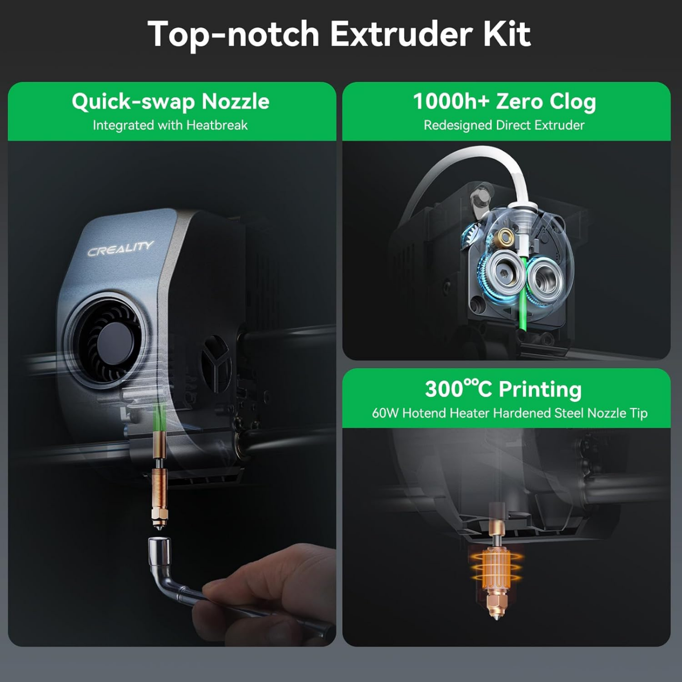 - "Unicorn" Quick-Swap Extruder: High-flow (60W heater), all-metal direct drive with a clog-free, tri-metal quick-swap nozzle.