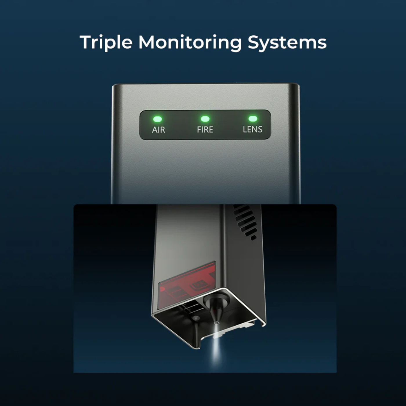 - Groundbreaking Integrated Air Assist: Automatically adjusts airflow (via LightBurn) or manually to remove smoke, protect the lens, and ensure cleaner cuts.